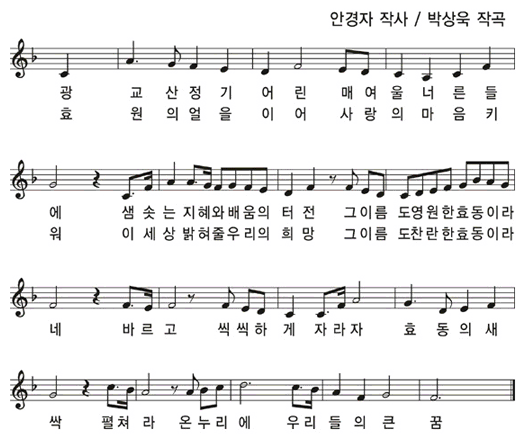 의미 꿈, 믿음, 긍지를 지닌 자랑스런 한국인으로서 세계로 꿈을 펼침 ᄒ : 개나리 꽃잎 ᄃ : 효동 동의 ᄃ, 개나리의 잎